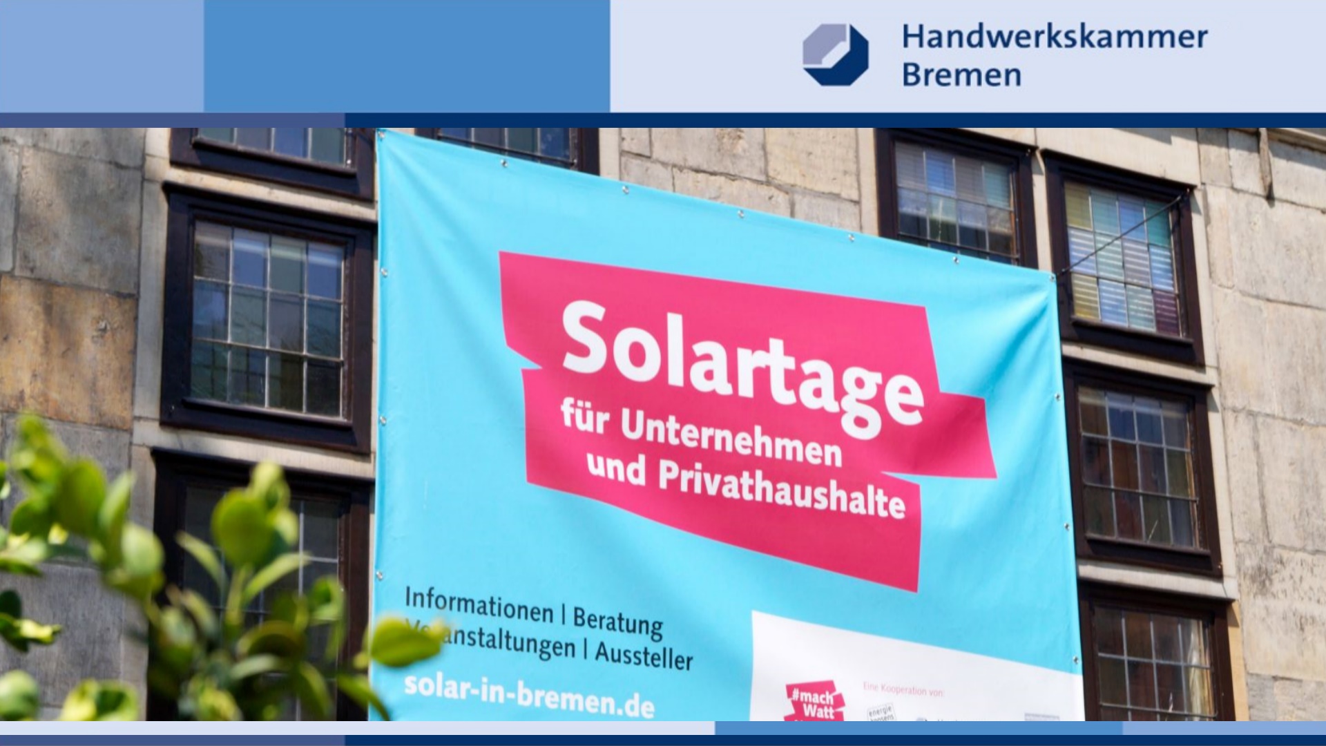 Die Solartage in der Handwerkskammer Bremen sind eine zentrale Informations- und Netzwerkveranstaltung für alle, die sich für Photovoltaik, Solarthermie und die Energiewende interessieren. Fachbetriebe, Handwerkerinnen und Handwerker, Hauseigentümer sowie Kommunen erhalten hier gebündeltes Wissen über aktuelle Fördermöglichkeiten, technische Innovationen und Praxisbeispiele rund um die solare Energieerzeugung.